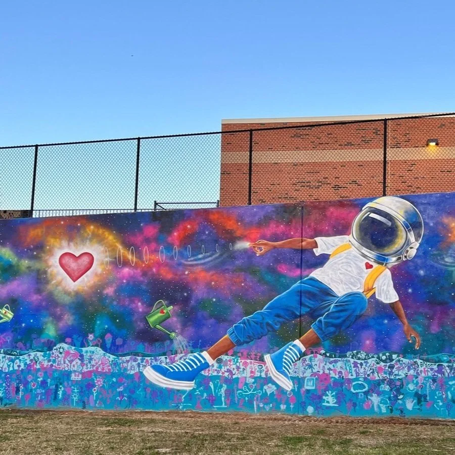 Based on the NFT character Aku from artist Micah Johnson, 1,000 K-5 students at Brumby worked with Paint Love for over a month to “plant” their dreams in this cosmic garden on a huge 1,000 square foot wall and then work with local muralist Muhammad Yungai on the Aku character on the upper wall.